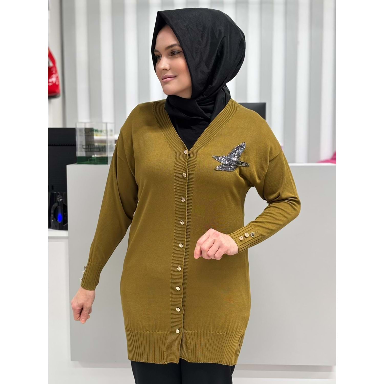 Pullu Taşlı Yanı Kuşlu Merserize Hırka 3207 - Yağ Yeşili - TEK BEDEN - AZRA06966-56095