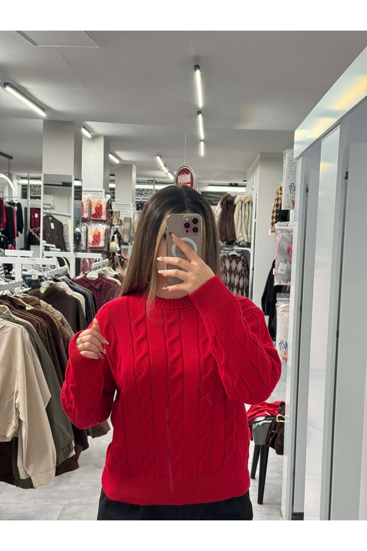 Saç Örgülü Triko Kazak 2573 - Kırmızı - TEK BEDEN - AZRA07511-59304