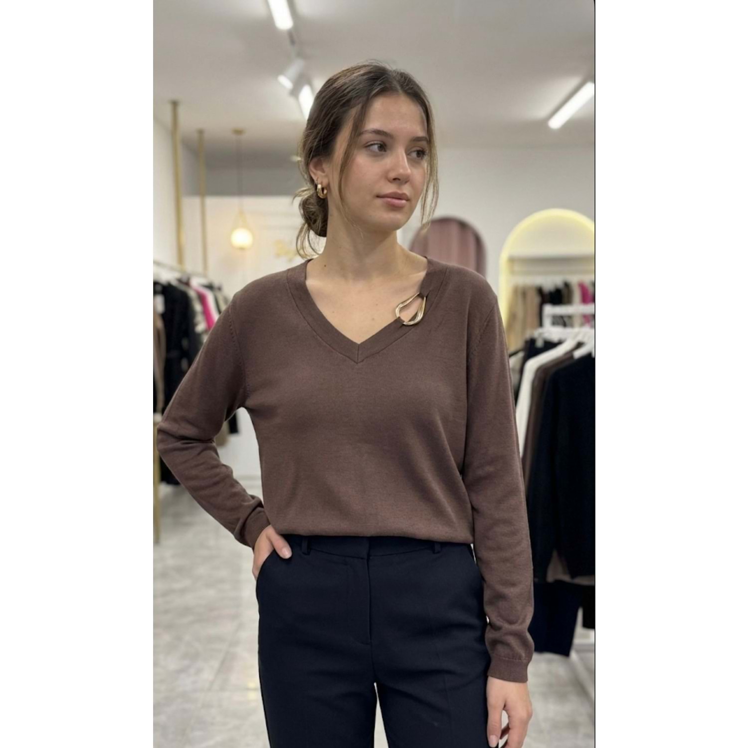 Yakası Tokalı V Yaka Kazak 1456 - Acı Kahve - S - AZRA07465-Acı Kahve-S